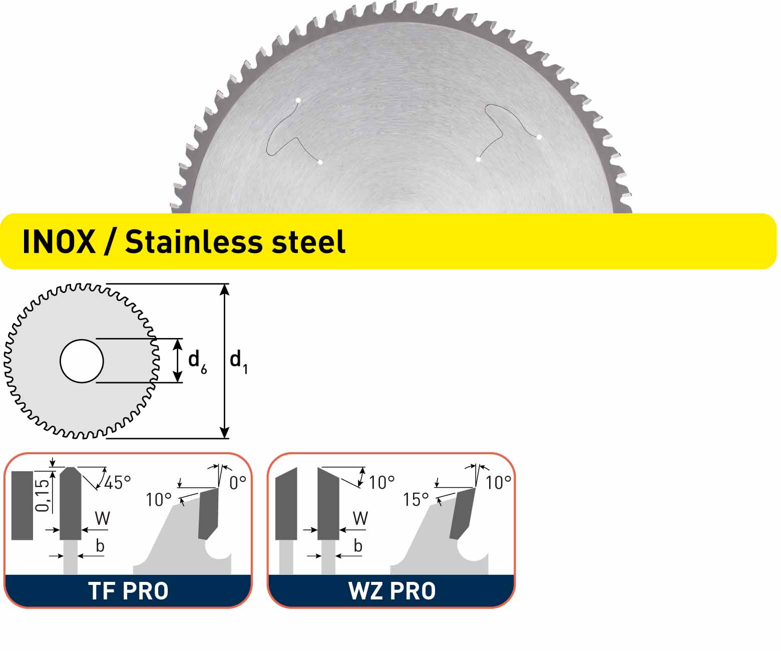 | Execution For dry-cutting stainless steels on so called "dry-cutter" machines. Thanks to an extreme wear resistant carbide from Japan, tool life is extended considerably. Application Suitable for sawing stainless steels (INOX). ![]() ![]() |