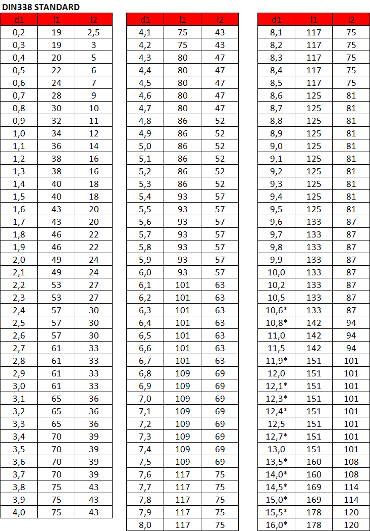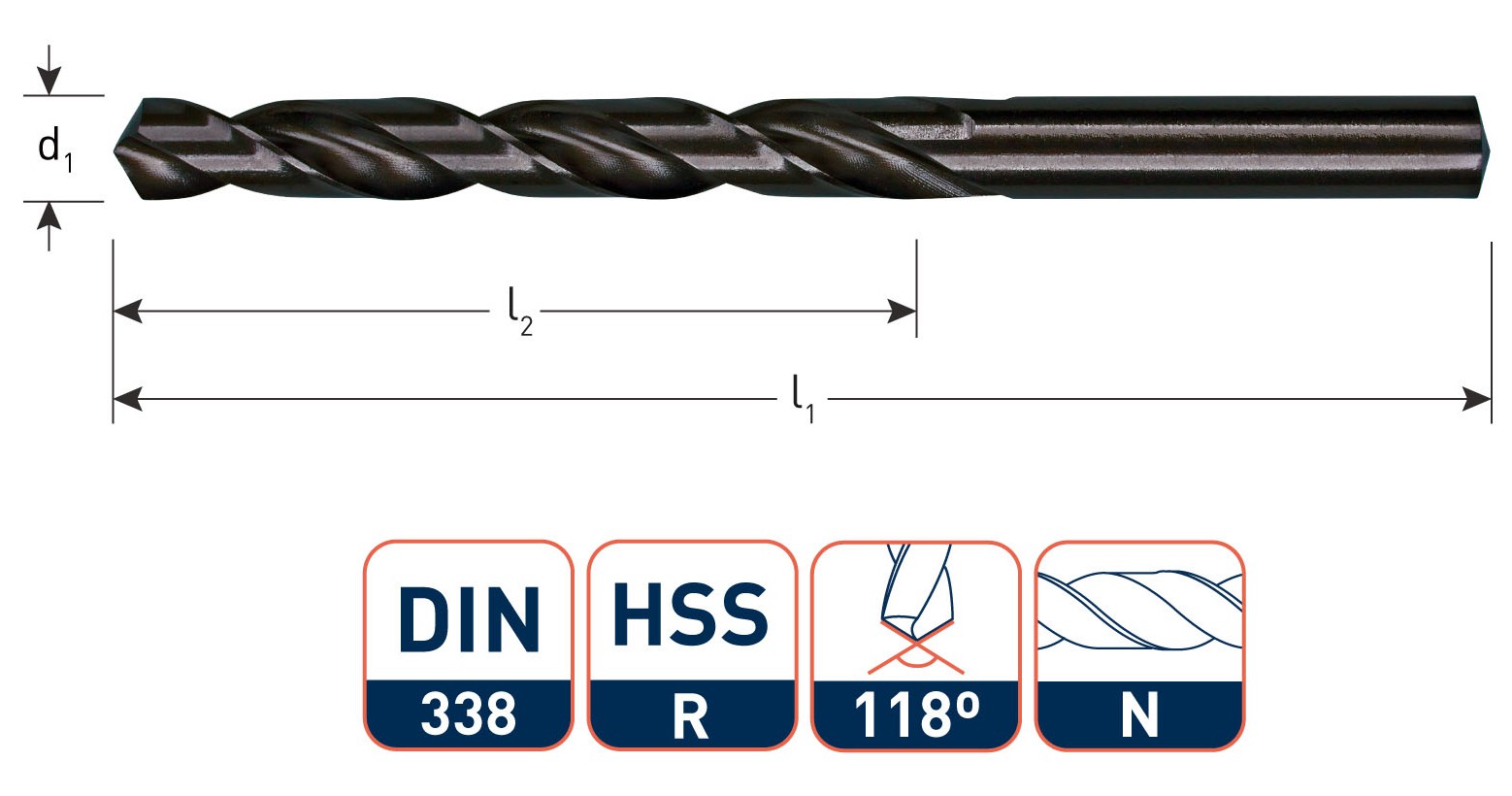 | Execution HSS-R drill bit, DIN 338, roll forged, point-angle 118°, type N Application General-purpose drill, to drill steels with tensile strength up to 1.000 N/mm2, cast steel, grey cast iron, malleable cast iron, nickel brass and graphite. ![]() ![]() |