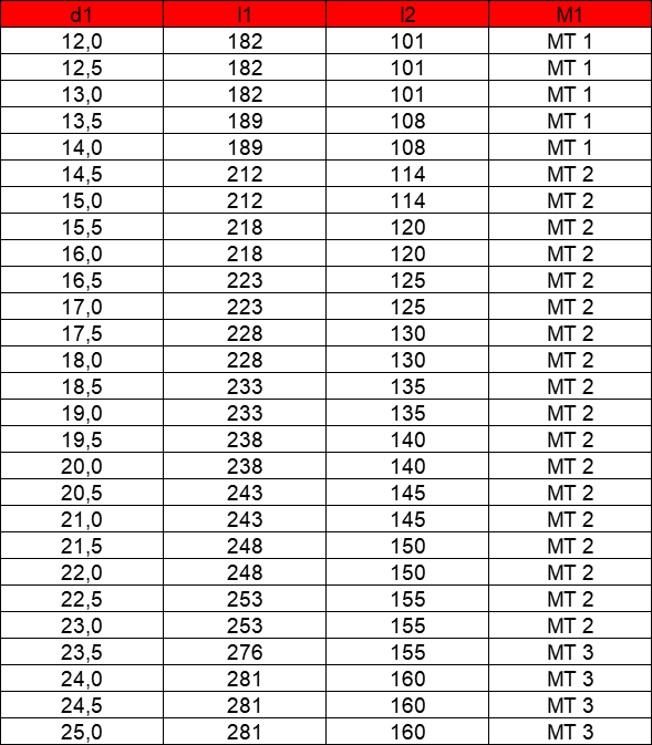 | Execution HSS-Co Drill bit with taper shank, DIN 345, short, ground flutes, split-point (DIN 1412-C), point angle 135°, heavy-duty type Application For drilling of steels with tensile strength up to 1.400 N/mm2, very hard bronze, stainless steels as well as heat- and acid resistant steels ![]() ![]() |