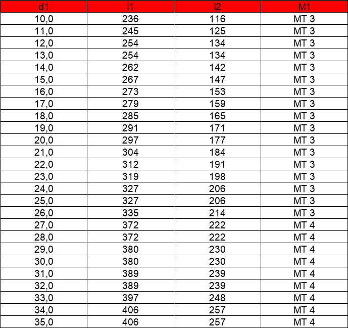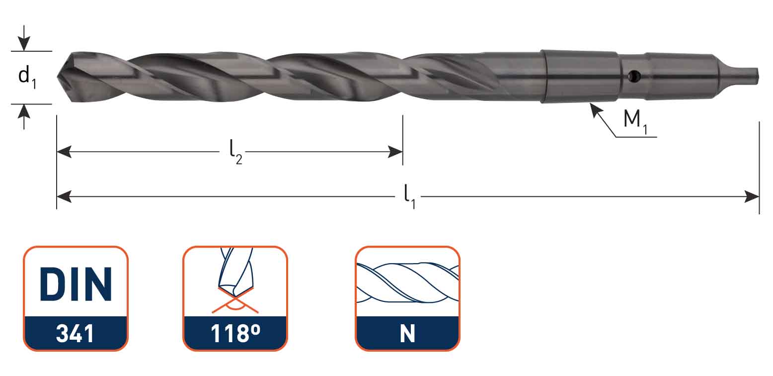 | Execution HSS Drill bit with taper shank, DIN 341, long, point with thinned web (DIN 1412-A), point angle 118°, type N-spiral, steam tempered. Coolant admittance can be either radially or axially. Longer tool life due to strongly increased cooling at the cutting edges. Application General-purpose use on most common materials such as steel and cast iron as well as stack drilling of sheet metal ![]() ![]() |