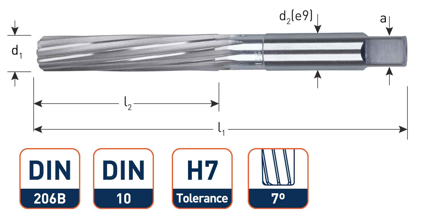 | Execution HSS hand reamer according to DIN 206-B with cylindrical shank, 7° left hand spiral, right hand cutting, long tapered chamfer, for holes with H7-tolerance. Application For reaming of most common materials such as steel, cast-iron, plastic etc. Very well suited for repairs and revisions. Not suitable for blind holes. ![]() ![]() |