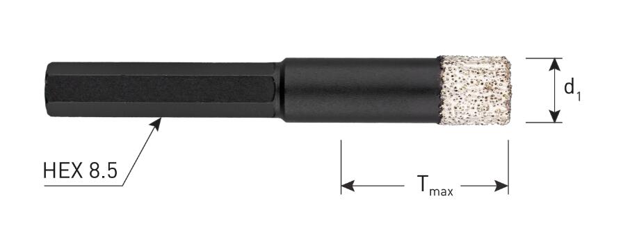 | Execution Galvanic plated diamond drill bits with hexagonal (HEX 8.5) shank. Interior with hardwax for cooling. Application For drilling accurate, splinter-free and clean holes (without coolant supply / dry cutting) in rockhard tiles, flagstones, granite and ceramics. Remove core after each hole. ![]() ![]() |