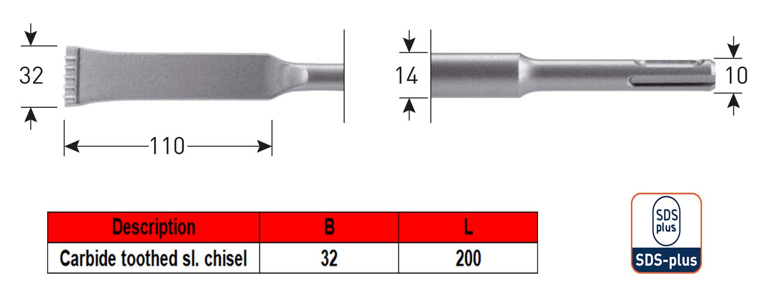 | Execution Carbide toothed slotting chisel for removing (intact) bricks and/or seams. On these chisels is no warranty with regard to tool life. ![]() |