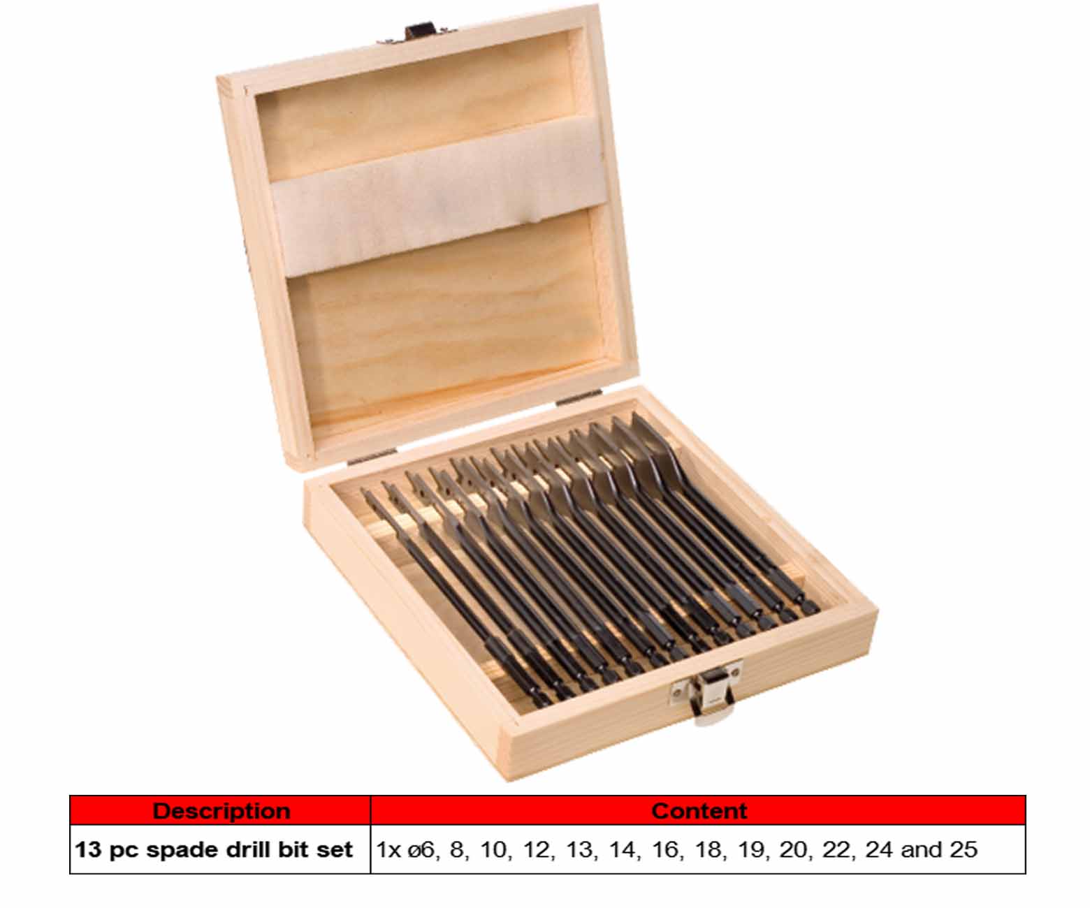 Spade drill bit 13pc set, in wooden case |