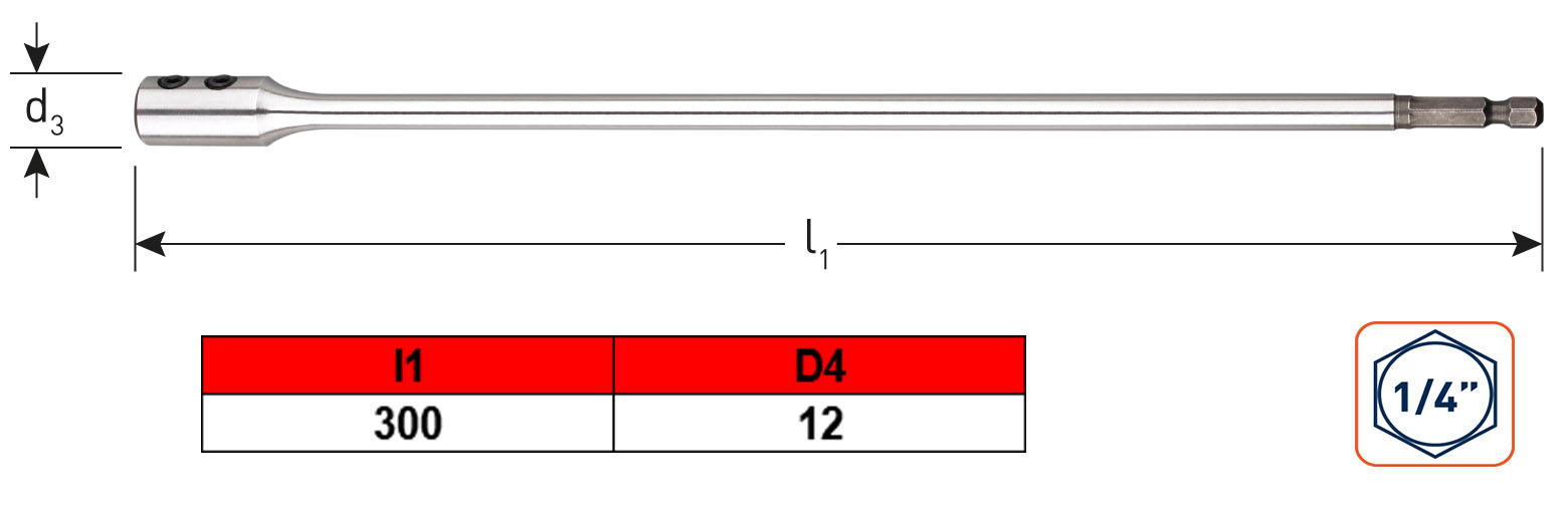 | Execution Shank extensions for spade drill bits with ¼” shank according to DIN 3126-E6.3. ![]() |