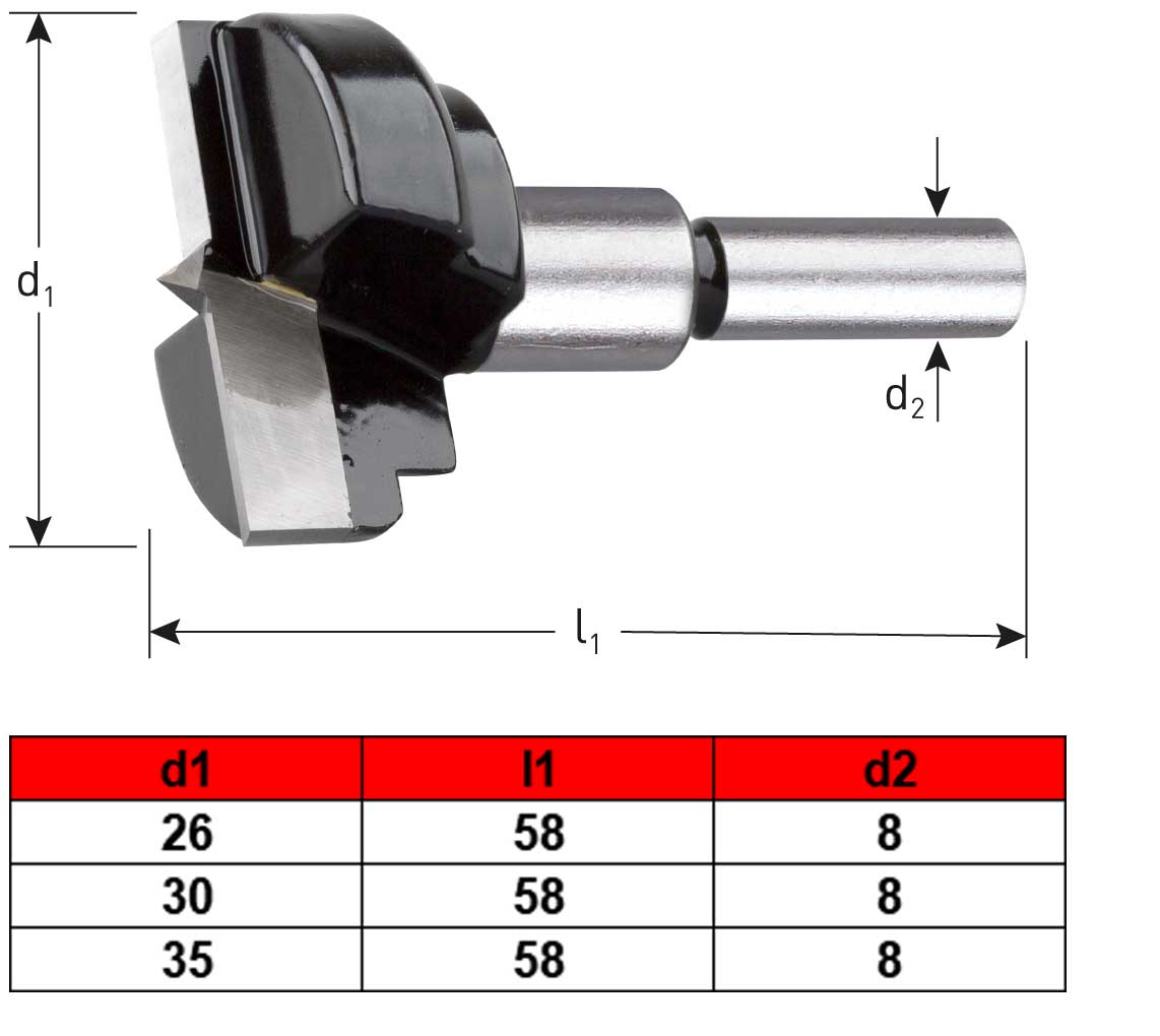 | Execution Tungsten carbide tipped hinge drill bits with centring point and two carbide cutters. Application Precise and accurate hole for the mounting of hinges in all kinds of wood, particle board and hard plastic laminated boards. ![]() |