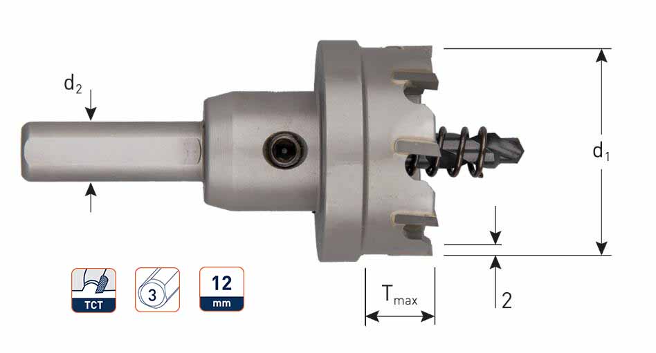 | Execution Tungsten carbide tipped hole saw. Thin cutting width of only 2mm results in low cutting forces, therefor ideal for handheld (cordless) power tools, even up to diameter 80mm! Supplied with fixed arbor, exchangeable pilot drill bit (1 pc) and ejector spring (1 pc). Application Steels and stainless steels, max. 5 mm depth of cut. Non-ferrous materials like (fibre reinforced) plastics, aluminium, sandwich panels up to maximum depth of 11mm (remove ejector spring). If applied on thicker materials, remove chips every 2-3 mm depth of cut. For all metals: use only a good cutting oil. ![]() ![]() |
