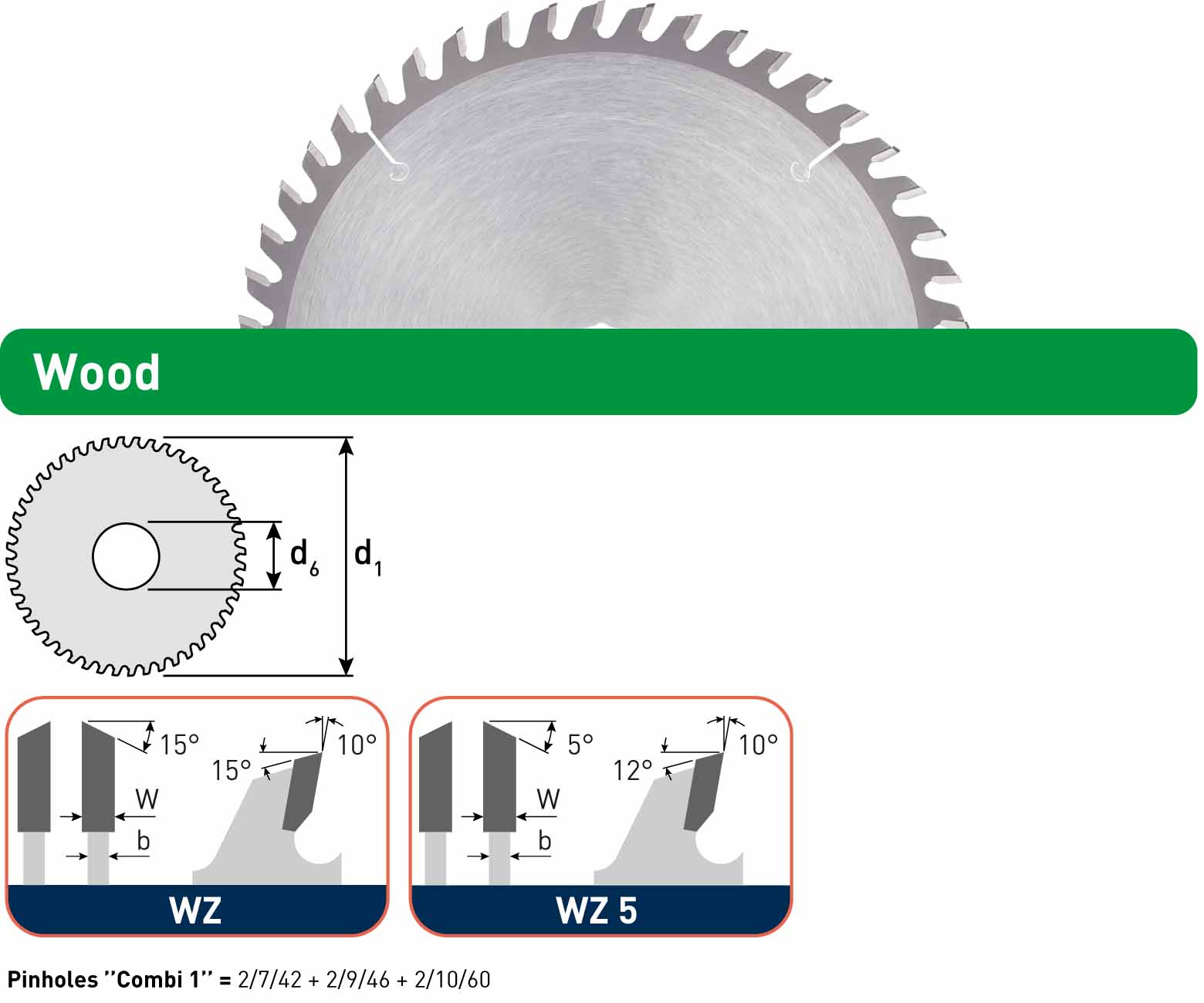 | Execution TCT teeth with positive cutting angle in alternating top-bevel geometry. Close pitch for fine cuts. Application Wide application range on many materials such as solid wood (soft and hard), precious woods like Bankirai, laminated wood, MDF, OSB, parquet, wooden profiles, particle boards, laminate, etc. ![]() ![]() |