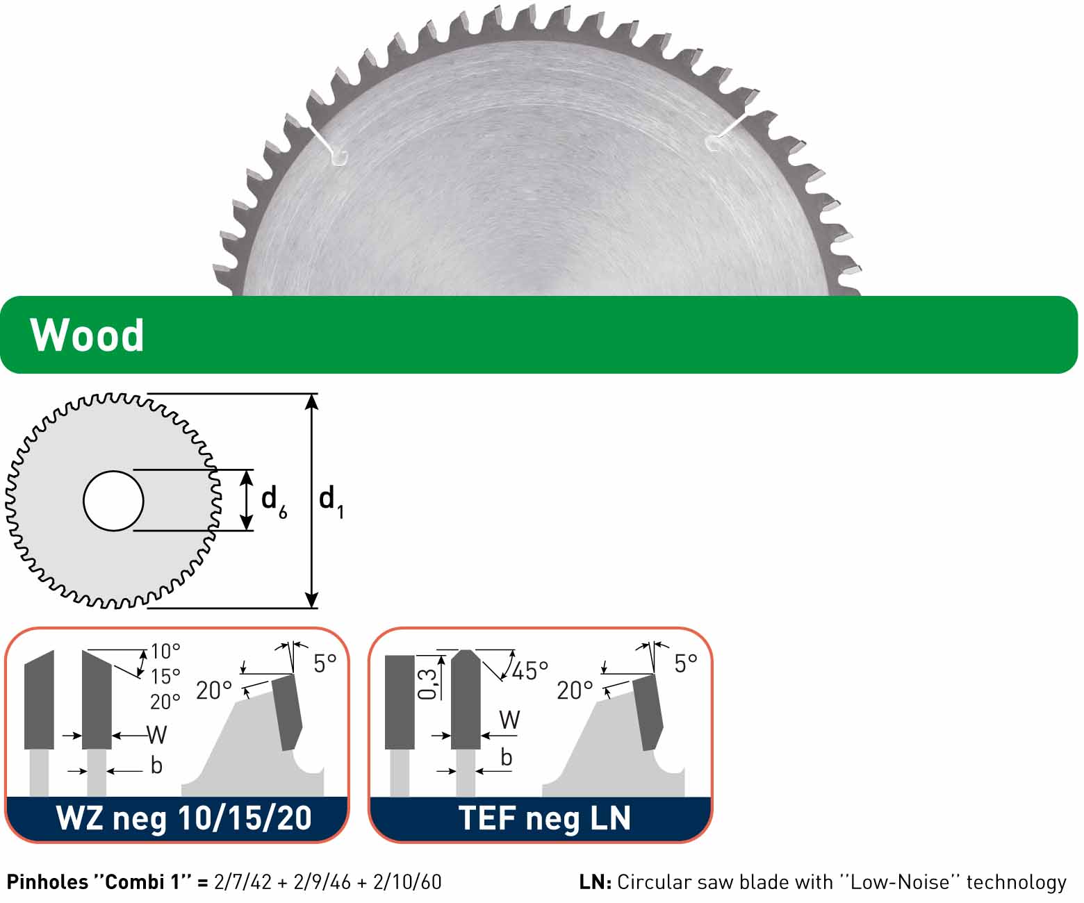 | Execution TCT teeth with negative cutting angle in alternating top-bevel geometry. Application Wide application range due to negative and therefor strong geometry. For chop and mitre applications on all popular types of wood. ![]() ![]() |