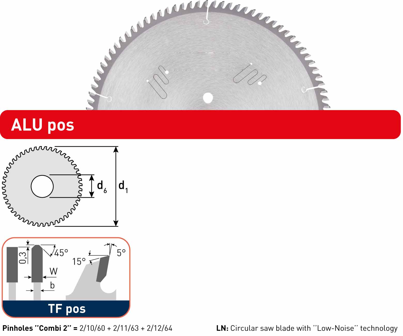 | Execution TCT teeth with positive cutting angle in alternating trapezium-flat geometry. Application For use on stationary machines. Sawing of aluminium (solid material), copper (solid material) and other non-ferrous metals (like brass), acrylic glass and plastics (solid material). ![]() ![]() |
