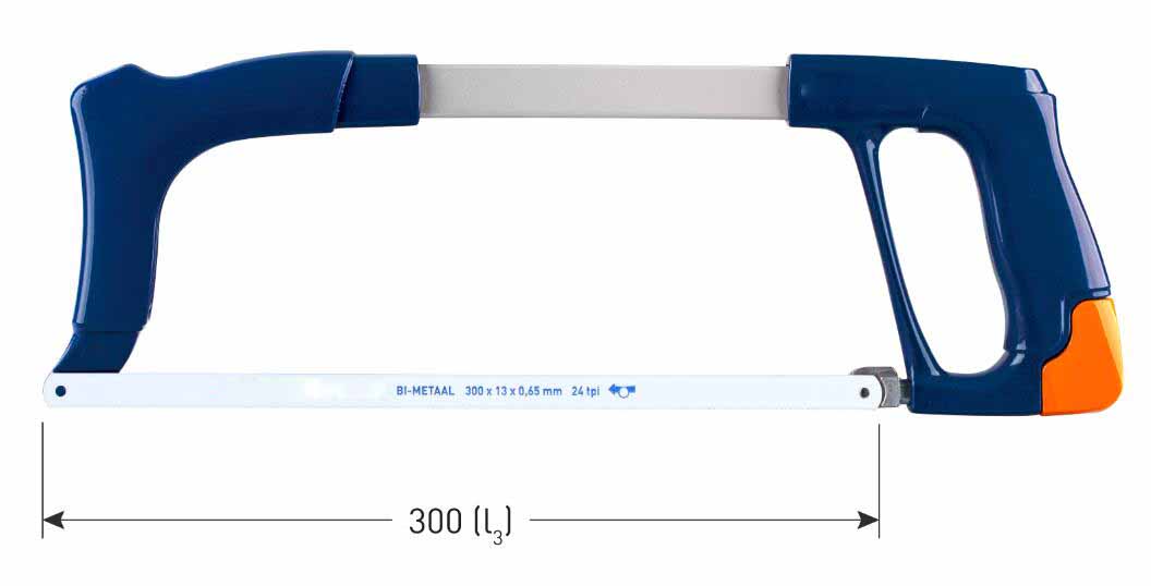 | Execution Light, ergonomically shaped hack saw frame, aluminum alloy. Blade-change mechanism maintains tension setting. Extremely tight blade setting for clean and straight cuts. 0° and 55° blade setting for flush cuts. ![]() |