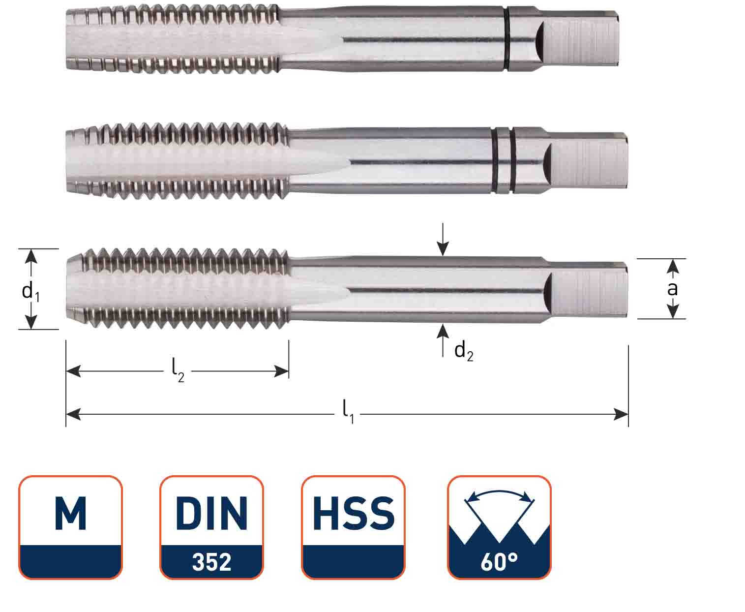 | Execution HSS hand tap sets according to DIN 352, metric thread, sets of 3 taps. ![]() ![]() |