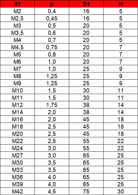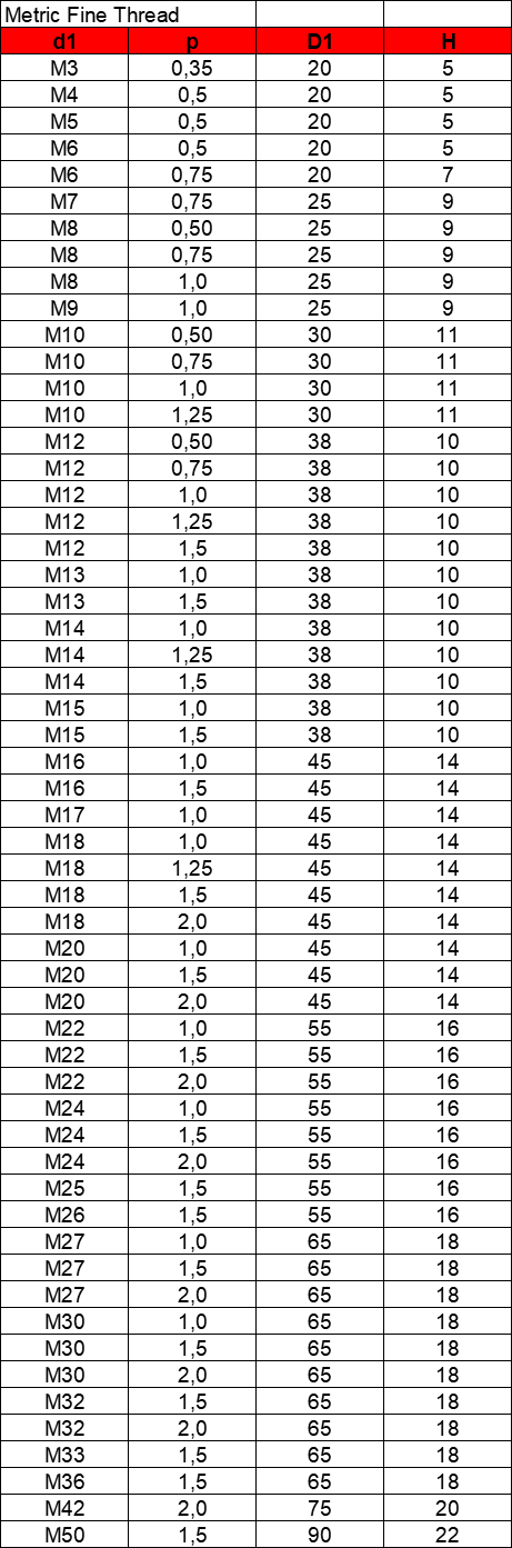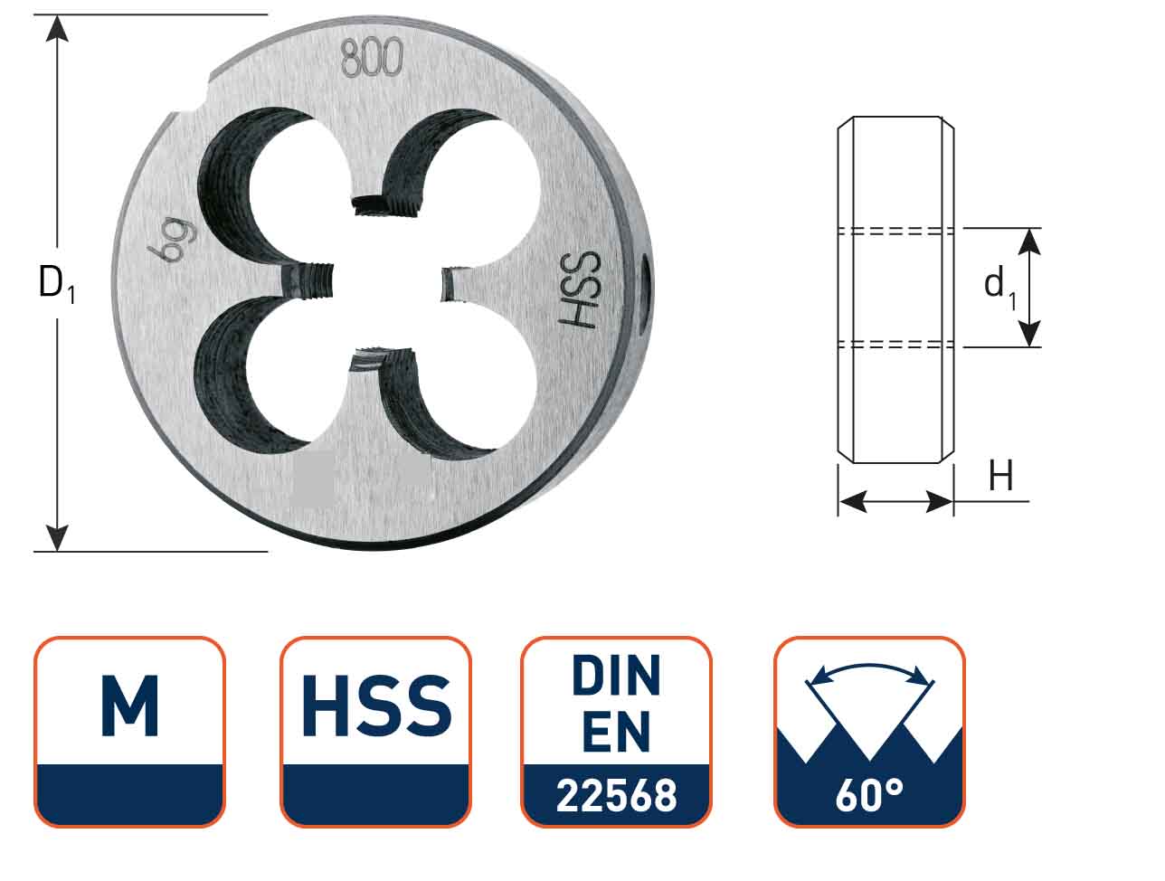 | Execution HSS round thread dies, according to DIN-EN 22568, for metric threads. Thread MF / UNC / BSP / NPT are also available Application For tapping of (alloyed) steels with tensile strength. ![]() ![]() ![]() ![]() ![]() ![]() |