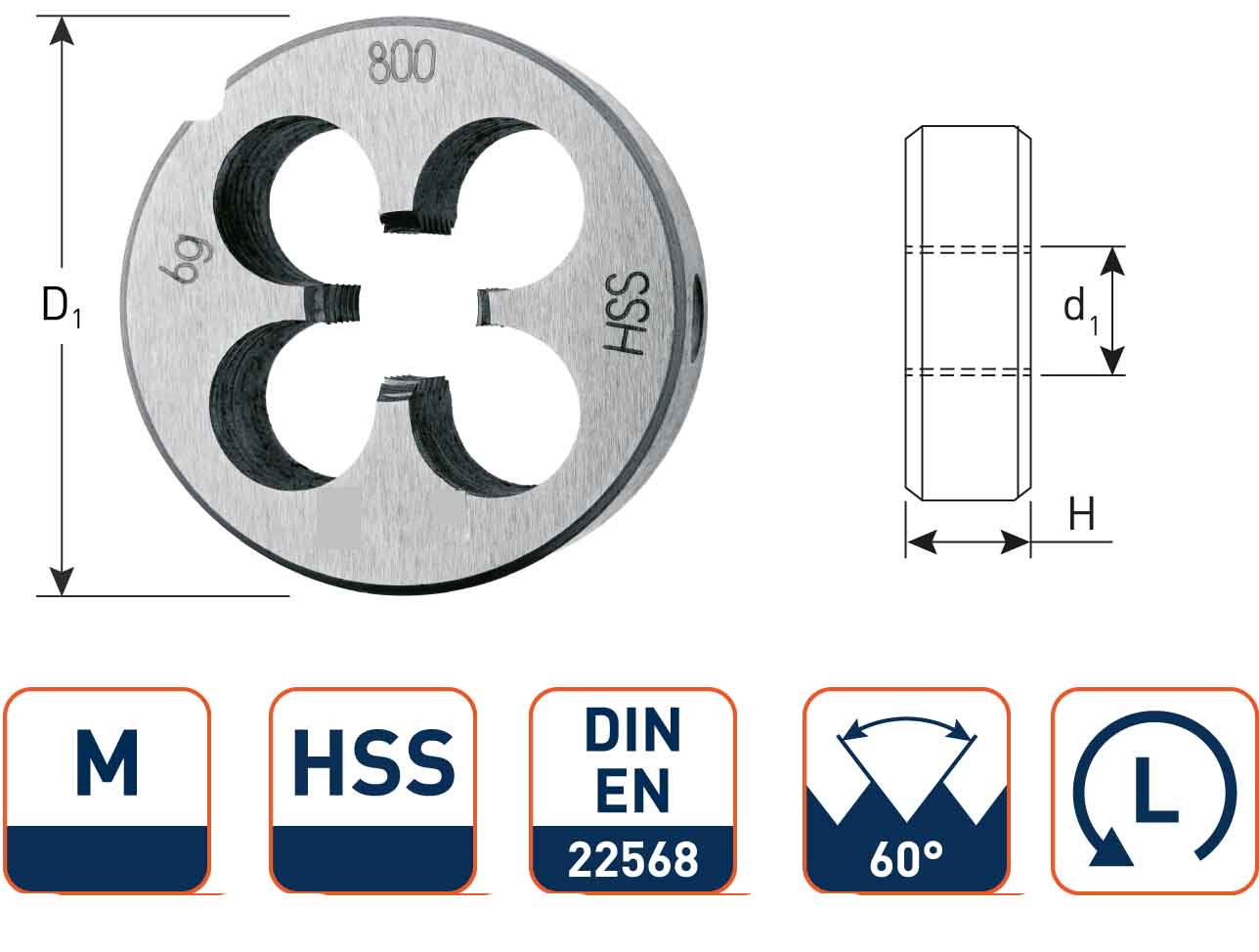 | Execution HSS round thread dies, according to DIN-EN 22568, for left-handed metric threads. Application For tapping of (alloyed) steels with tensile strength. ![]() ![]() |