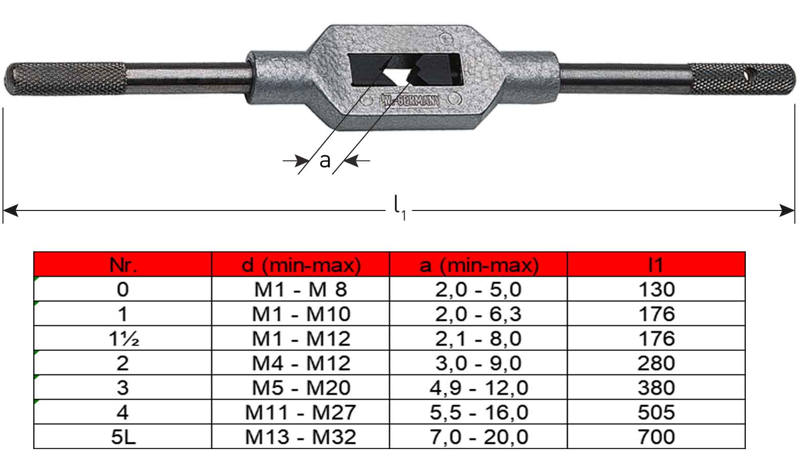 Adjustable tap wrenches according to DIN 1814, made of aluminium-zinc alloy, steel jaws, for hand taps.