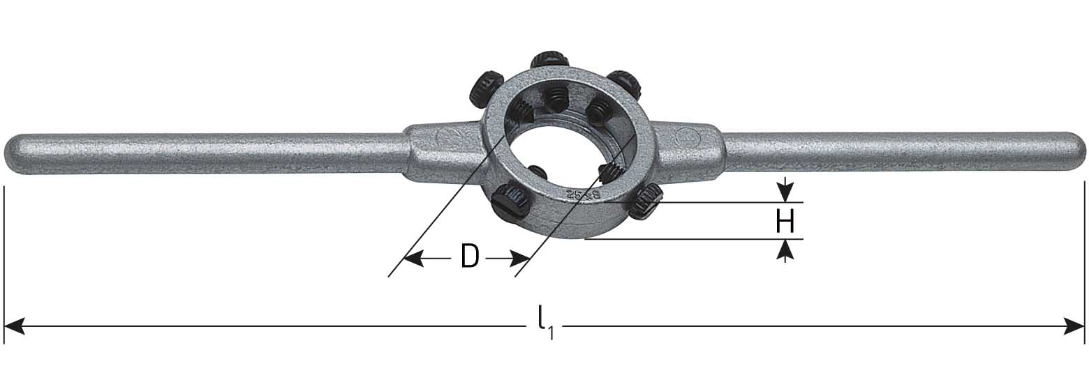 | Execution Die stocks according to DIN 225, made of aluminium-zinc alloy, steel screws, for threading dies according to DIN EN 22568. ![]() ![]() |