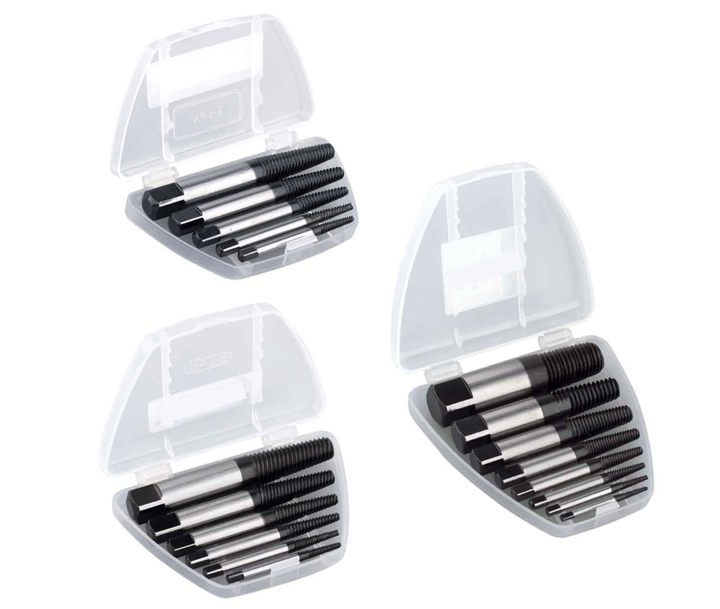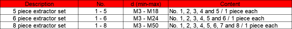 | Execution Spiral screw extractors, in sets, tempered steel, for use on broken screws and bolts with a right-handed thread. Application Drill locked screw out to proper diameter. Insert extractor and turn anti-clockwise using tap wrench. Keep on turning so the extractor digs itself into the screw until enough torque can be applied to remove the screw. ![]() ![]() |
